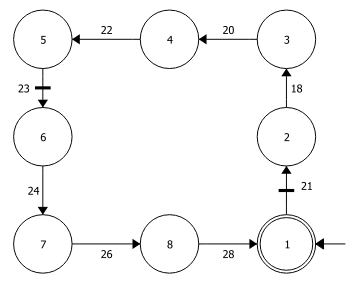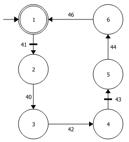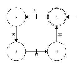 Com esse conjunto de eventos ({11, 13, 21, 23, 50, 51, 52, 53}) é feito a projeção de Sub1 e Sub2 e que geram Int1 e Int2, respectivamente. Dessa operação serão gerados dois autômatos com 30 estados cada.