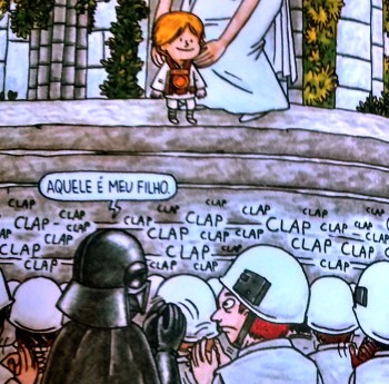 As charges de que mais gostei são aquelas que relacionam passagens dos filmes, como as mostradas a seguir.